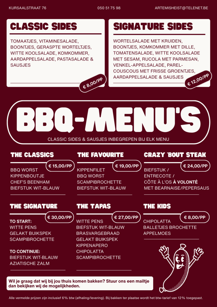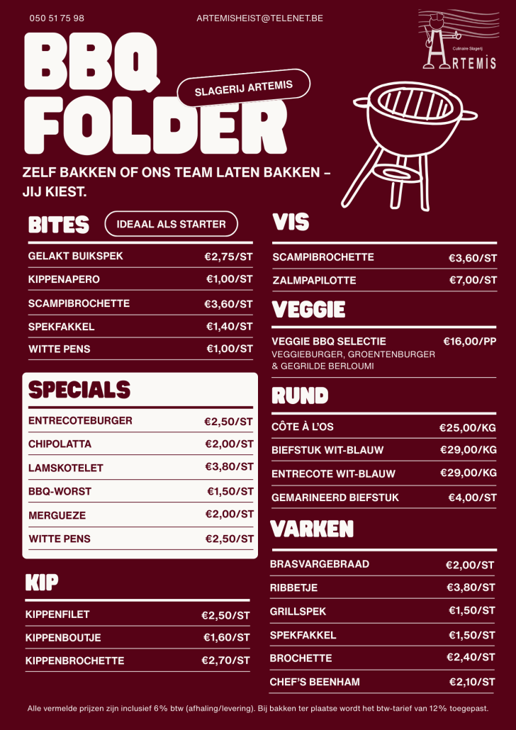 Alle vermelde prijzen zijn inclusief 6% btw (afhaling/levering). Bij bakken ter plaatse wordt het btw-tarief van 12% toegepast.
